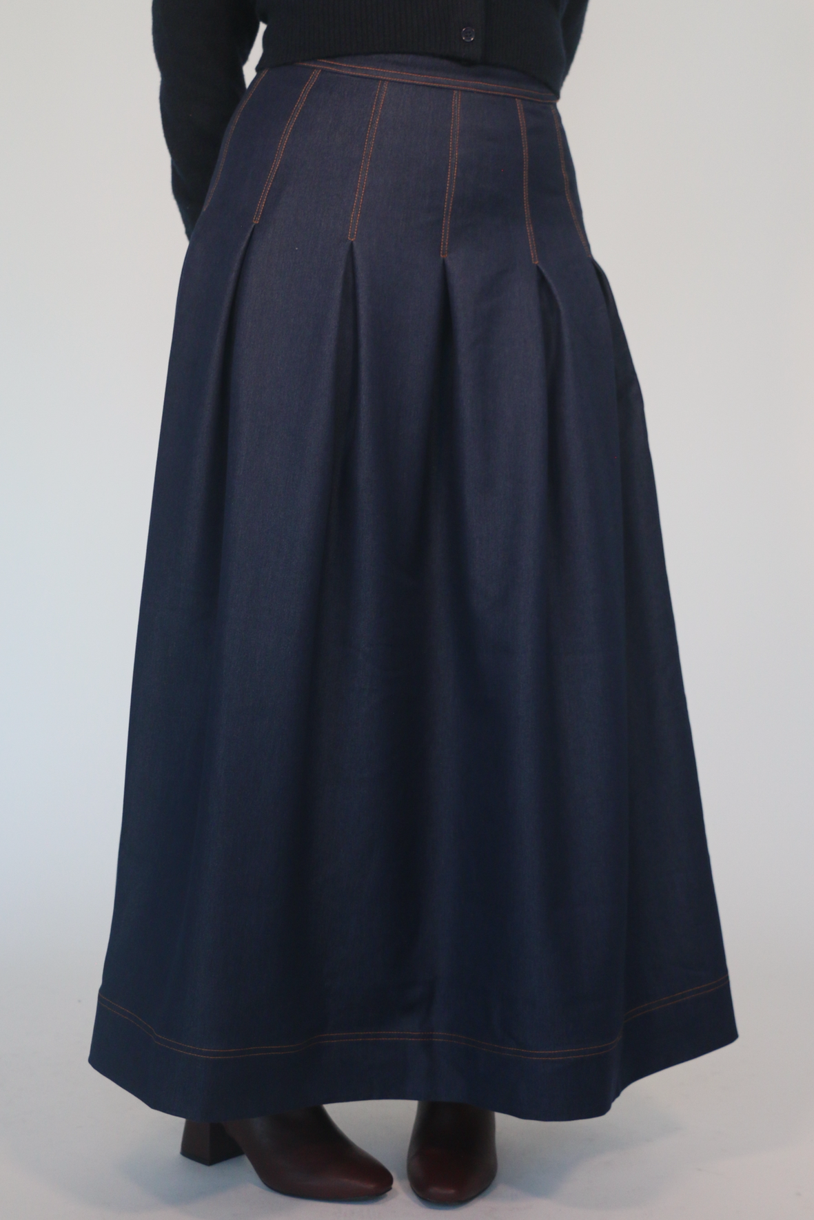 A full-length denim maxi skirt designed for movement, elegance and modest wear. This skirt sits comfortably at the waist and flows into a voluminous, panelled silhouette that drapes beautifully. Crafted from rich blue denim with subtle contrast stitching, this piece brings effortless refinement to any outfit.