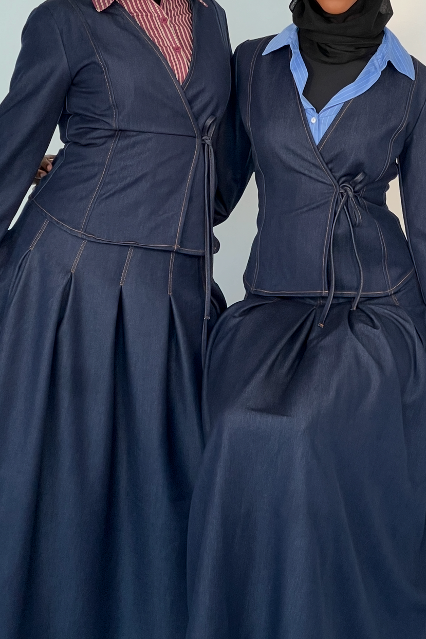A sculpted, wrap cardigan crafted from premium denim. Designed for a flattering, modest silhouette, this piece features a wrap front that ties securely at the waist, creating definition while remaining comfortable and lightweight. Clean panel lines and subtle contrast stitching add a refined finish, making it the perfect blend of structure and softness.